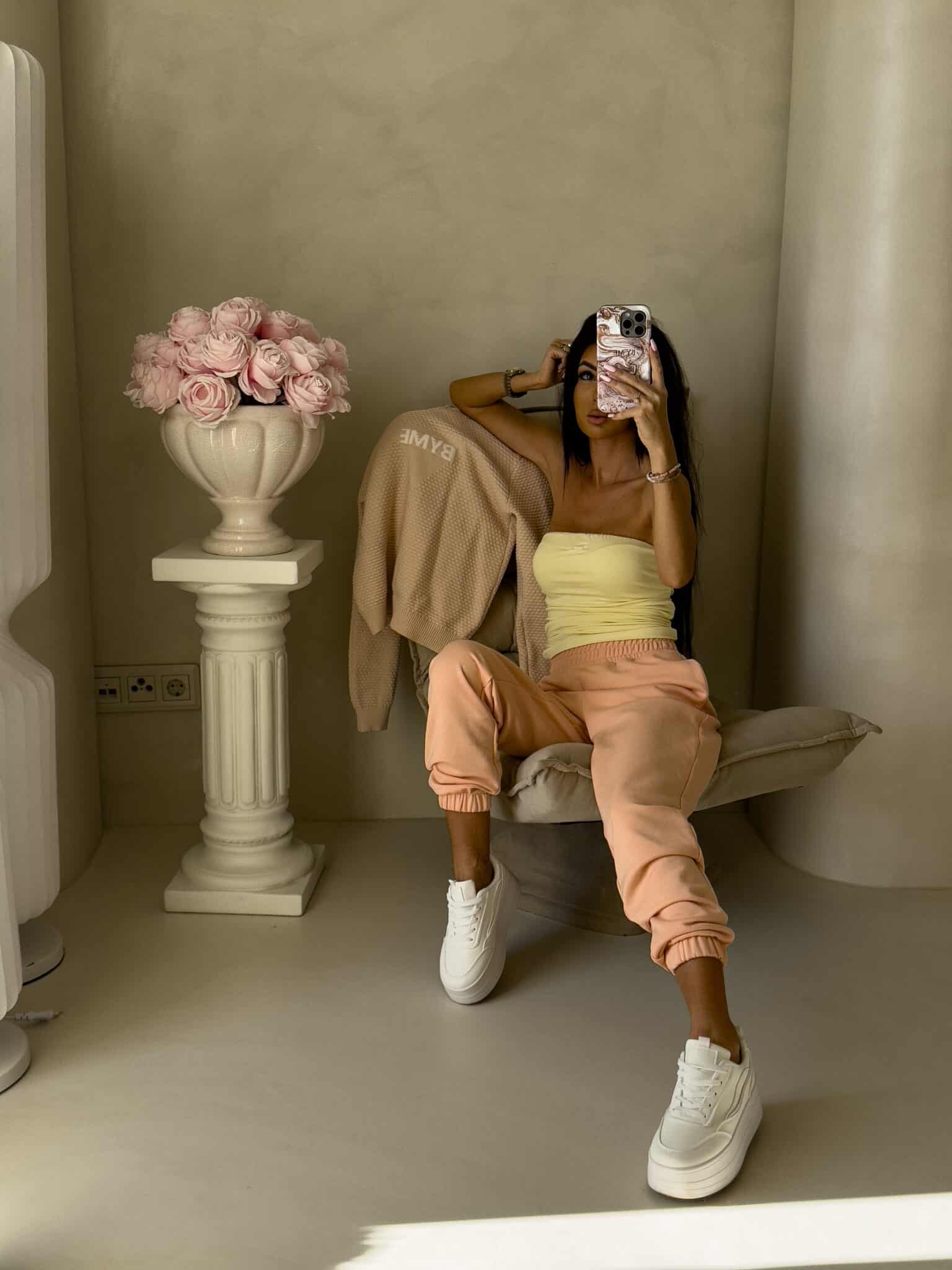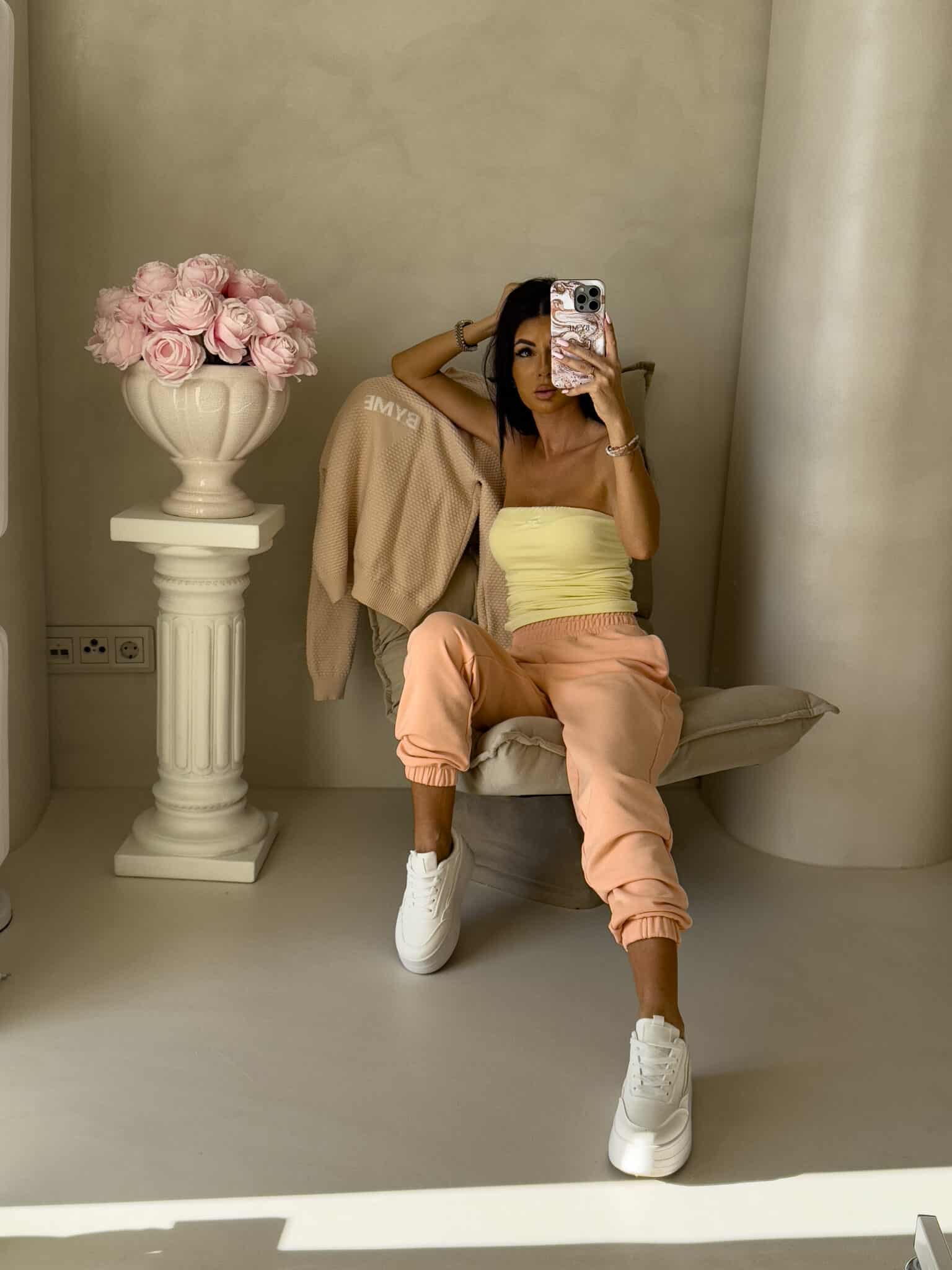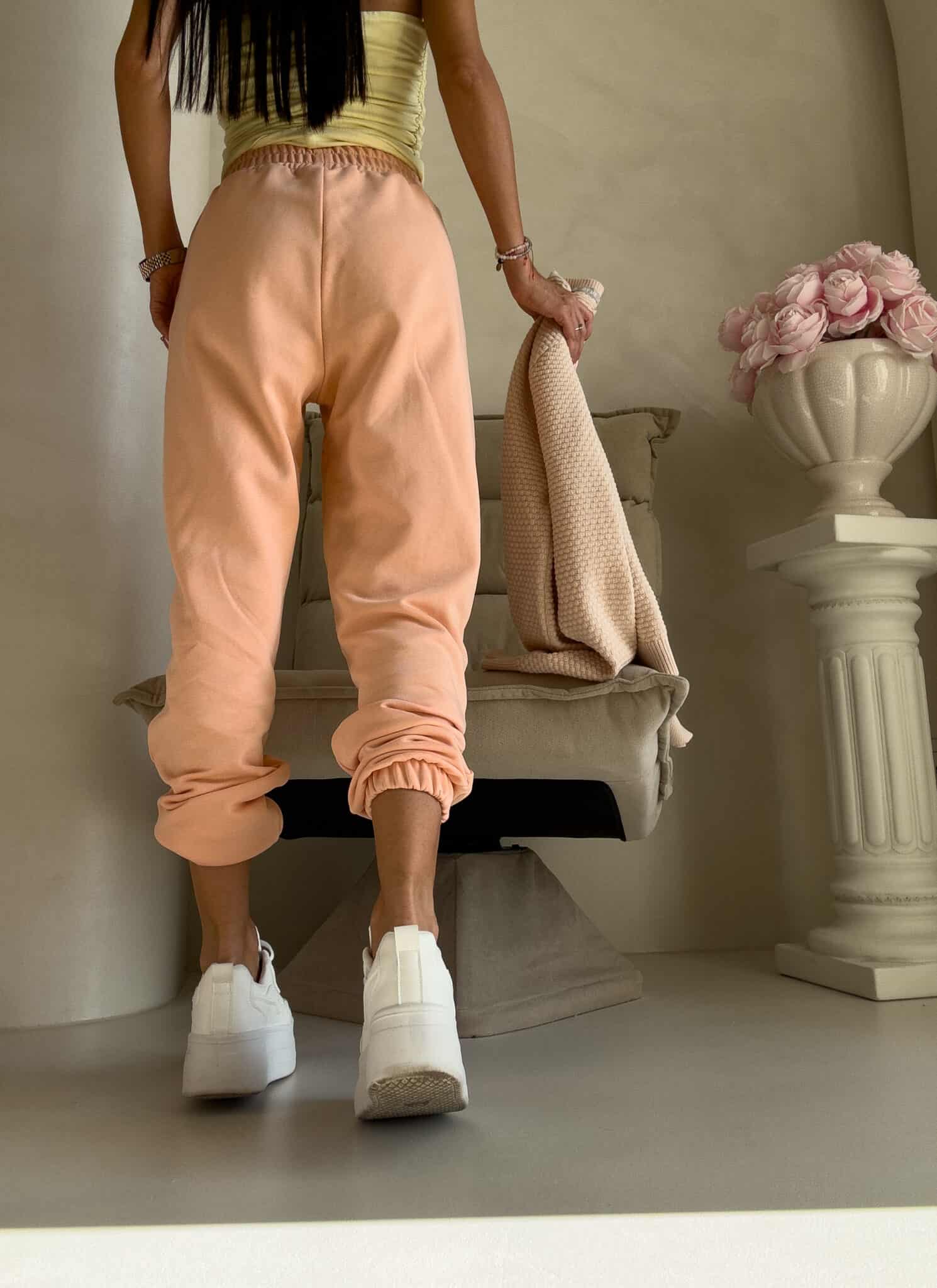 Spodnie dresowe – dopasowane, z elastycznym pasem w talii i ściągaczami na dole nogawek. Ich krój podkreśla sylwetkę, zachowując jednocześnie pełną swobodę ruchów.