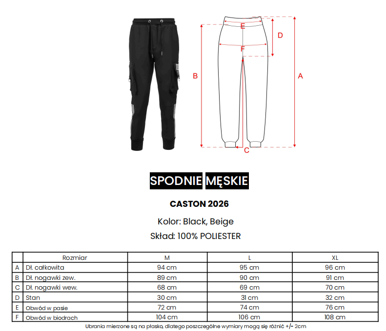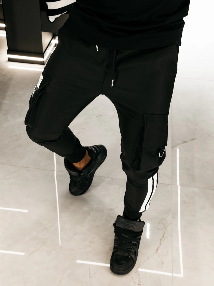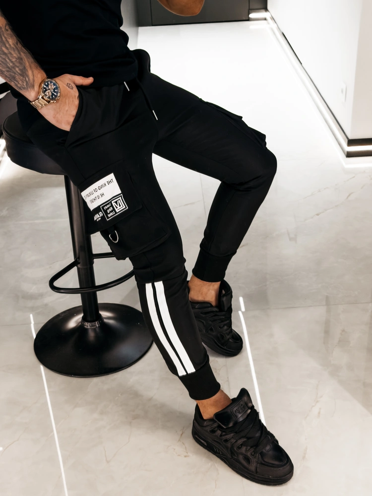 Casualowe męskie spodnie z wysokim stanem. Wykonane z wysokiej jakości, miękkiego oraz oddychającego materiału. Guma w pasie oraz regulacja poprzez sznurek. Po bokach kieszenie oraz kieszenie, typu cargo na nogawkach. Na kieszeni ozdobna naszywka z brandingiem oraz metalowy detal. Nogawki wykończone ściągaczami, z dekoracyjnymi wstawkami po bokach.