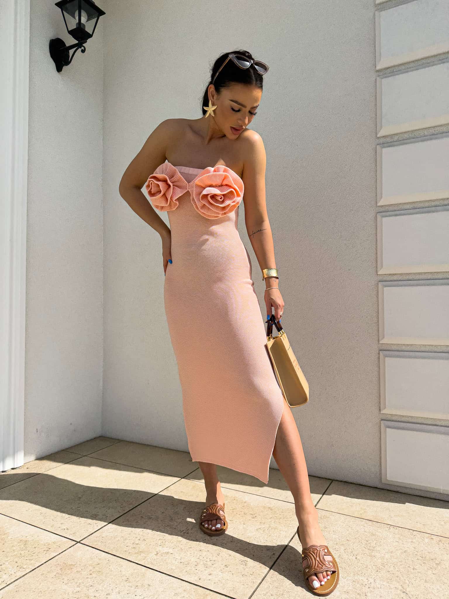 Zachwycająca sukienka o długości maxi, która łączy elegancję z romantycznym wdziękiem. Model z odkrytymi ramionami subtelnie podkreśla linię szyi i ramion, dodając kobiecego uroku. Po jednej stronie znajduje się zmysłowe rozcięcie, które nadaje lekkości i wydłuża sylwetkę.
