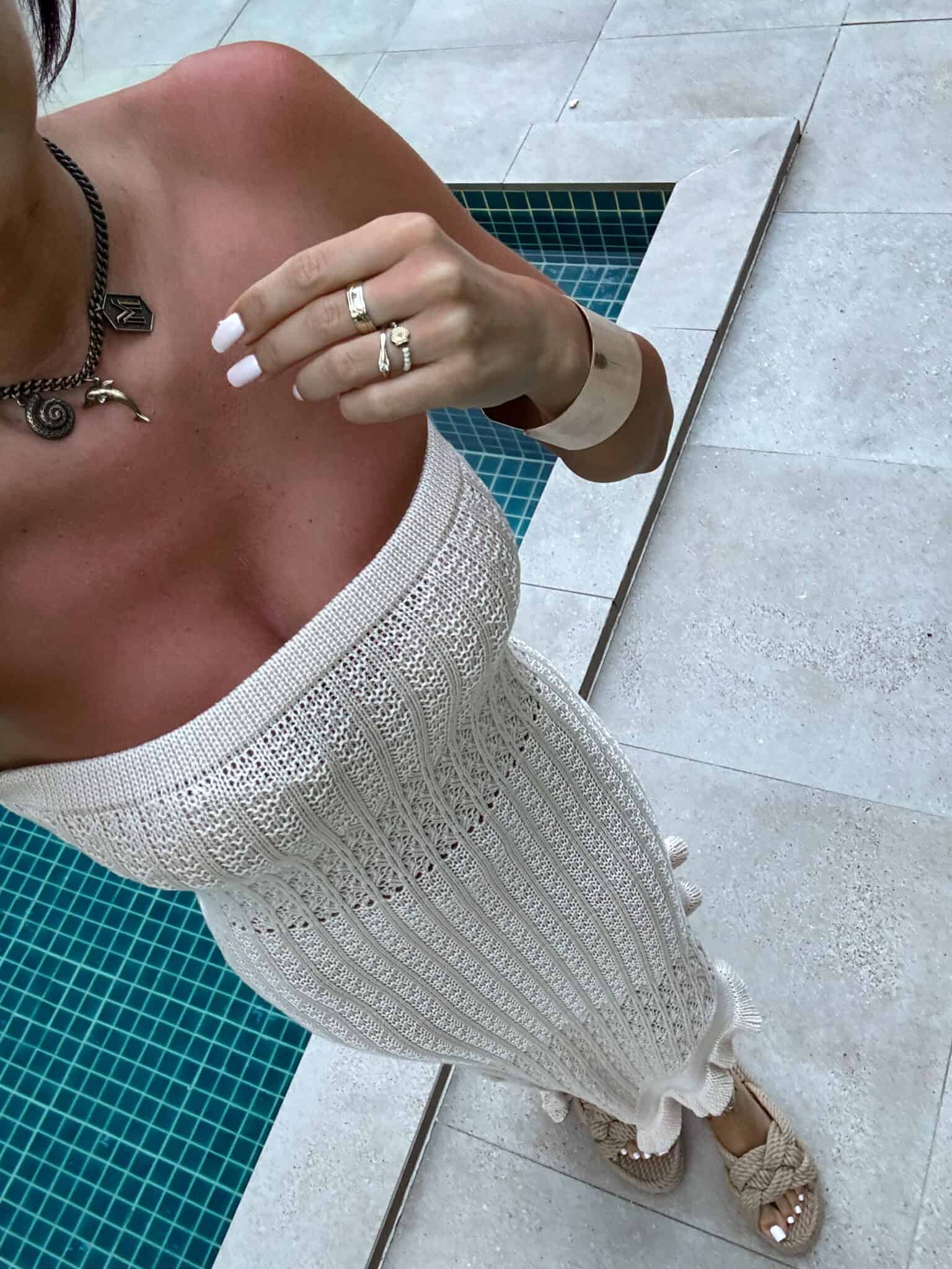 Zmysłowa i niezwykle stylowa sukienka maxi o dopasowanym kroju, wykonana z ażurowej, przewiewnej dzianiny – idealna na letnie, gorące dni. Model bez ramiączek z prostym dekoltem typu bandeau pięknie eksponuje ramiona i dekolt, podkreślając kobiecą sylwetkę.