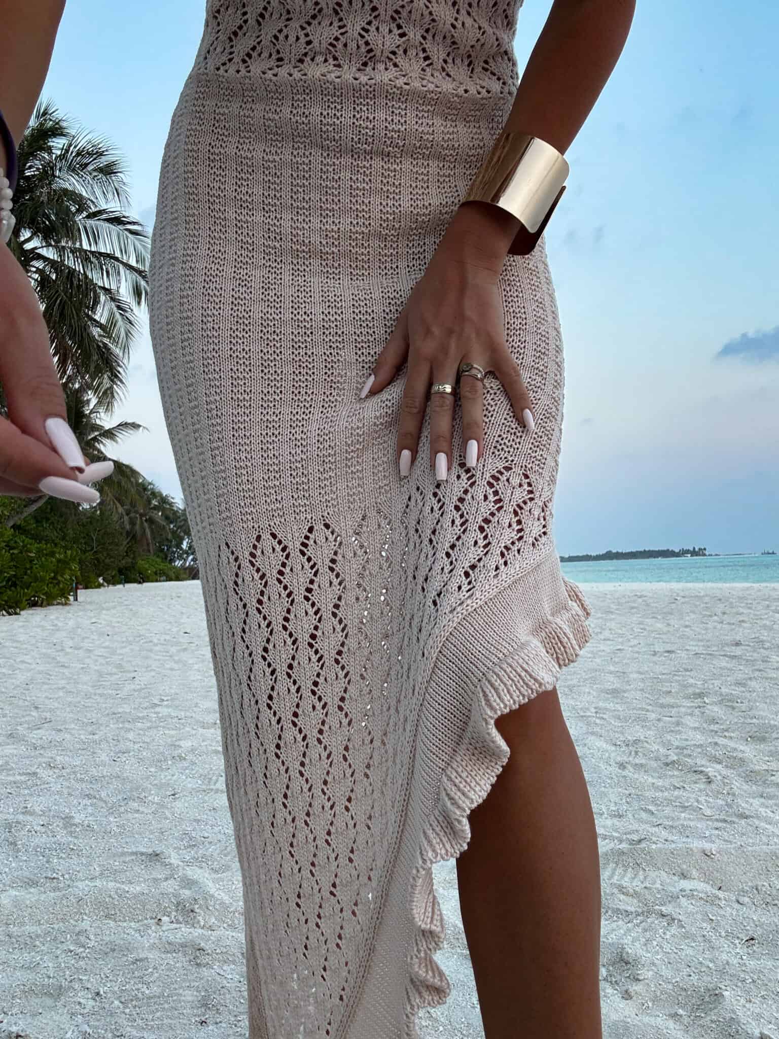 Sukienka wyróżnia się subtelnym, dekoracyjnym splotem oraz efektownym, asymetrycznym rozcięciem z falbaną, które dodaje lekkości i delikatnej zmysłowości przy każdym ruchu.