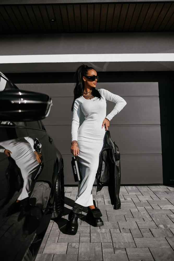 Sukienka maxi o dopasowanym kroju - elastyczna bawełna - model z długim rękawem lekko rozszerzającym się ku dołowi - okrągły dekolt eksponujący linię obojczyków - z tyłu zapięcie na zamek z logowanym pulerem - rozcięcie u dołu na tyle zapewniające swobodę ruchu - na przodzie subtelny haft.