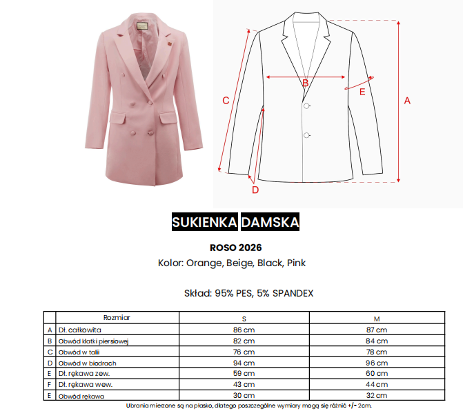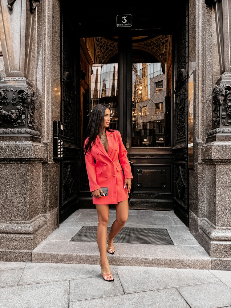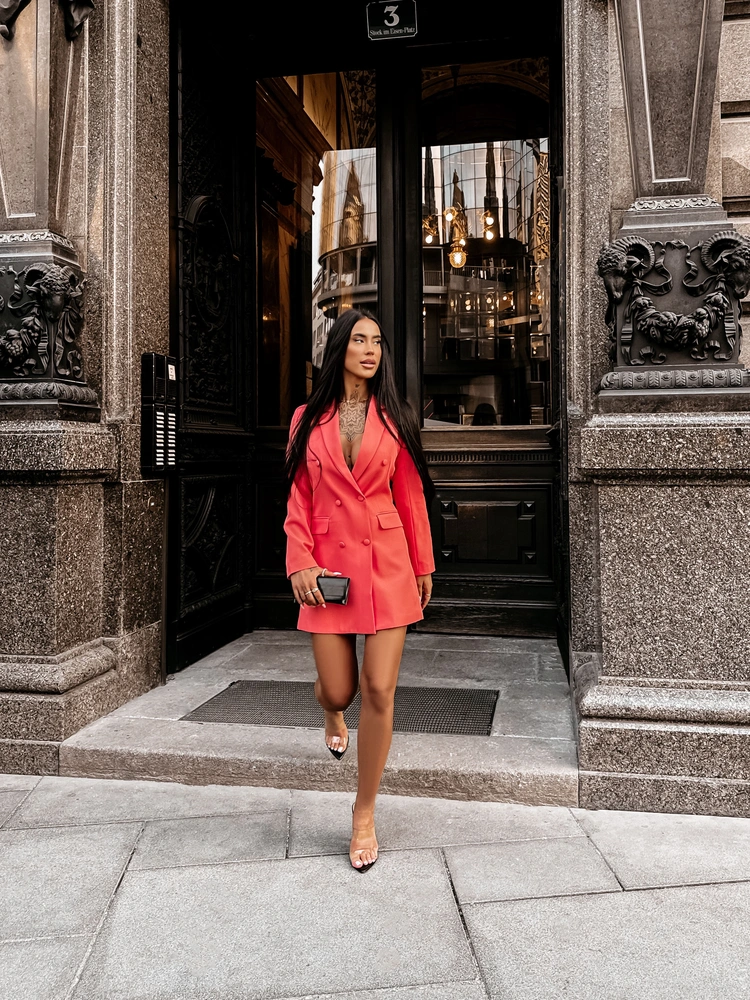 Dwurzędowa blazer dress - klasyczne klapy - długi rękaw - obciągane guziki w kolorze tkaniny - kieszenie z patką - modelujące sylwetkę zaszewki - długość mini - złota broszka z logo OLAVOGA.
