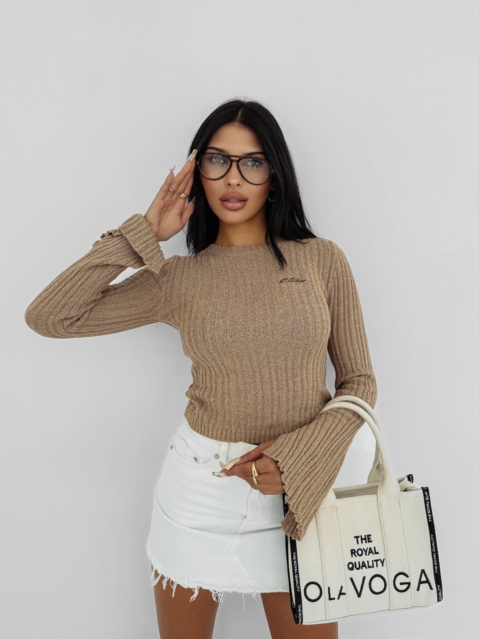 Dopasowany sweter o prążkowanej strukturze. Wykonany z elastycznej i przyjemnej w dotyku dzianiny. Długie rękawy rozszerzane ku dołowi, zakończone rozcięciem. Subtelne, kontrastowe logo OLAVOGA na przodzie produktu.