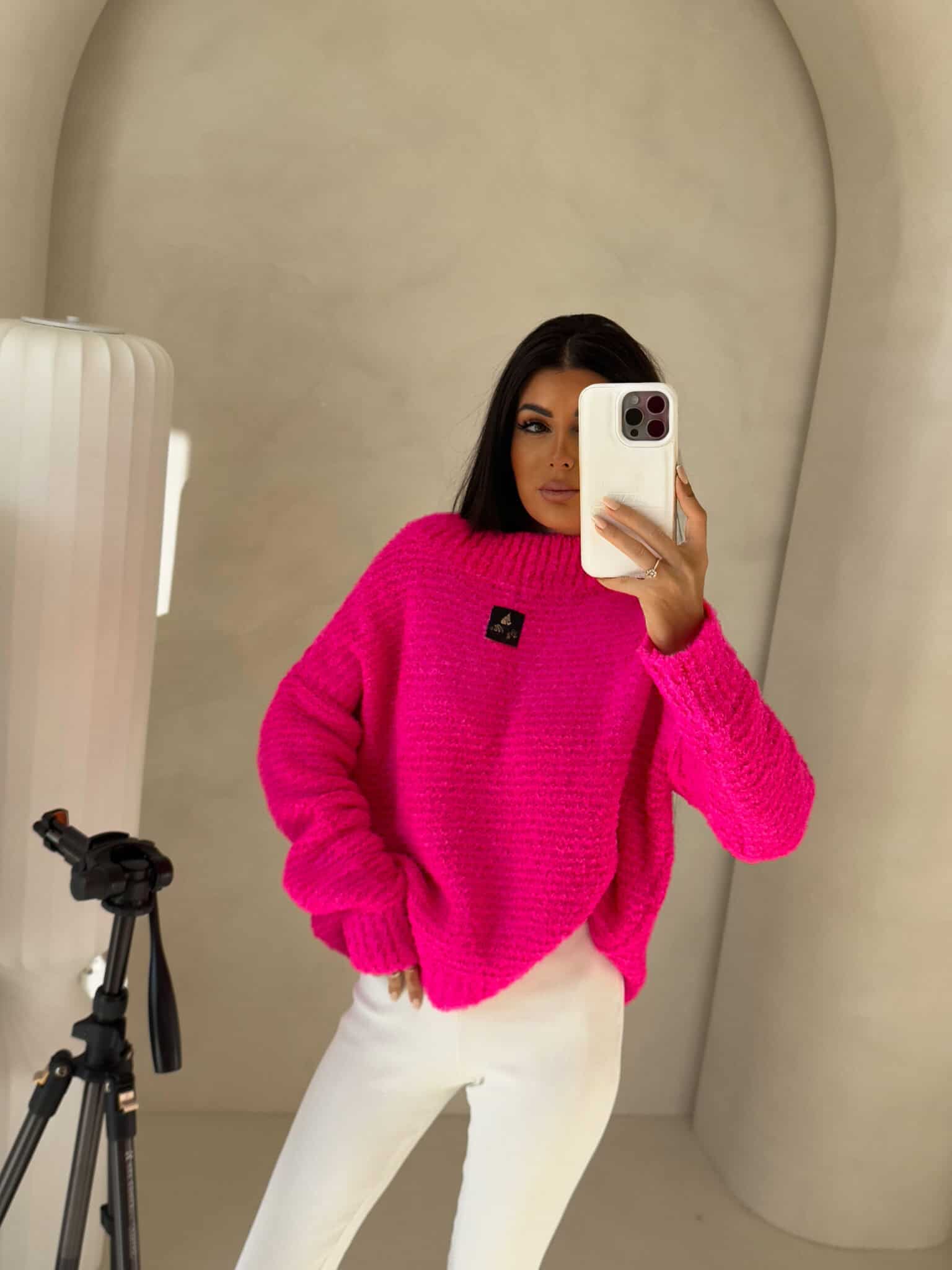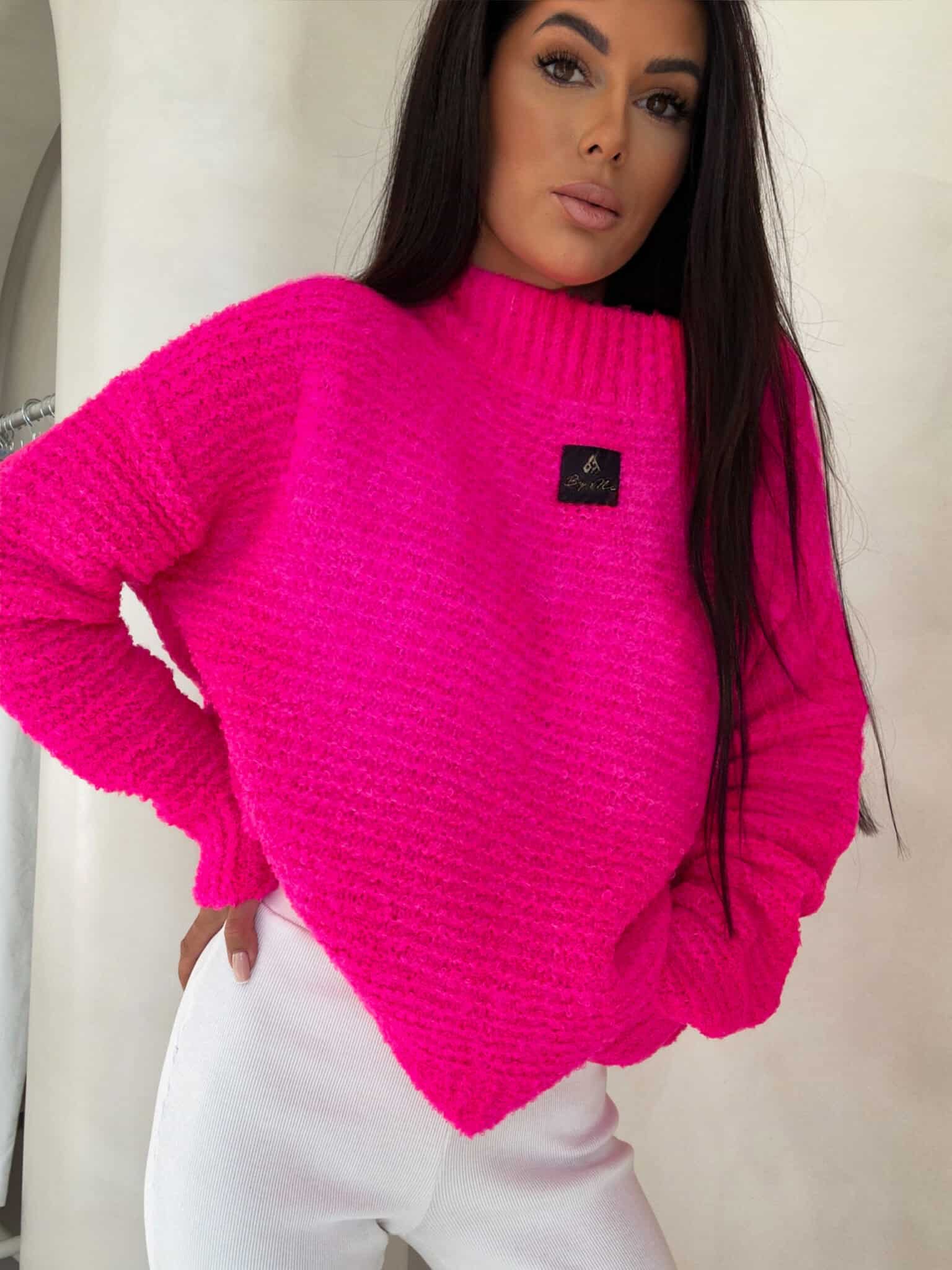 Sweter Bucla ma luźny, oversize’owy krój i jest wykonany z miękkiej, puszystej dzianiny. Posiada klasyczny, okrągły dekolt zakończony ściągaczem oraz długie rękawy, również wykończone szerokimi ściągaczami. Na przodzie, na wysokości klatki piersiowej, znajduje się mała, czarna naszywka z napisem „By Me” i delikatnym logo.