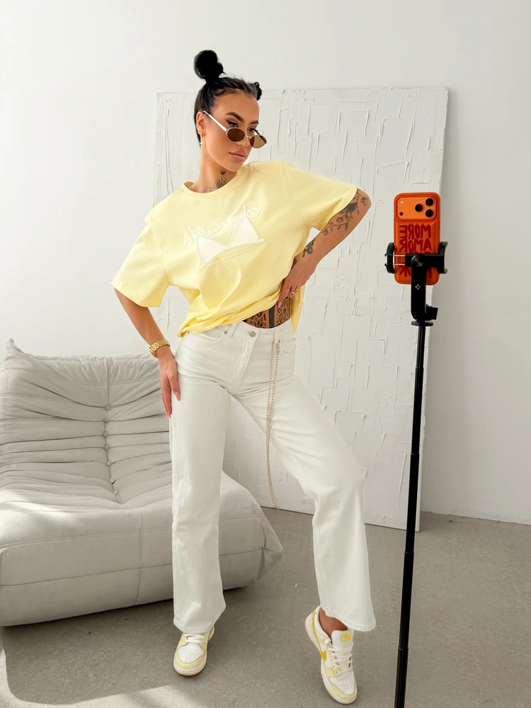 Fason oversize - wysokogatunkowa dzianina - okrągły dekolt - krótki rękaw - kontrastowa aplikacja wykończona ozdobnymi perełkami - wyraźne logo - chwytliwe hasło pod aplikacją wykonane metodą 3D.