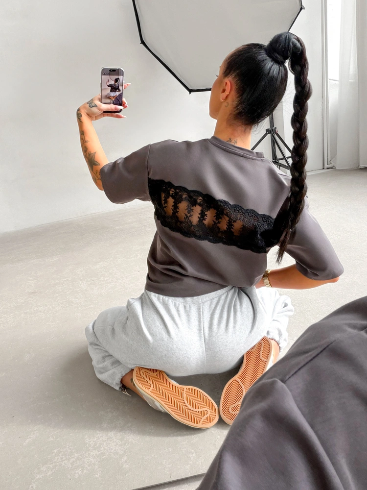 Fason luźny typu boxy - krótki rękaw - okrągły dekolt - na przodzie nadruk graficzny oraz wyraziste logo - na tyle kontrastowy panel z transparentnej koronki.