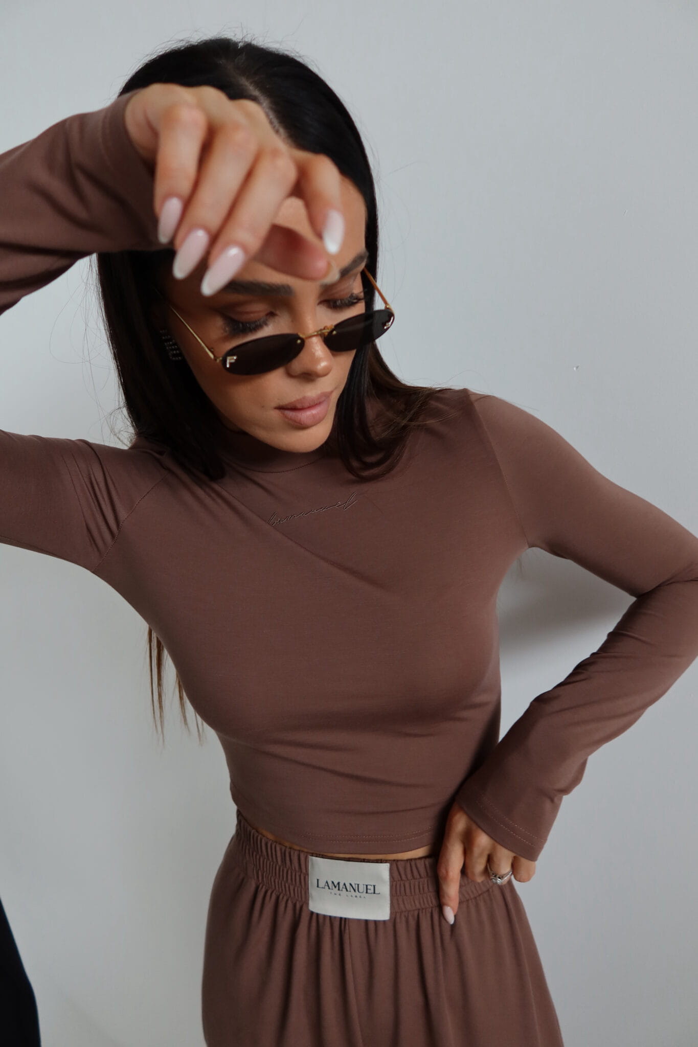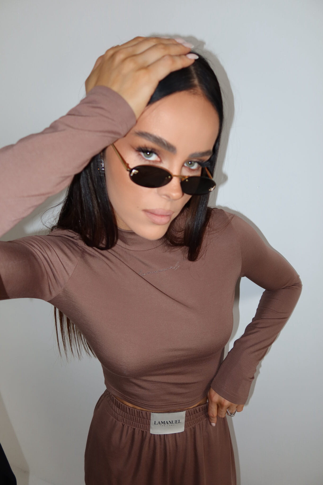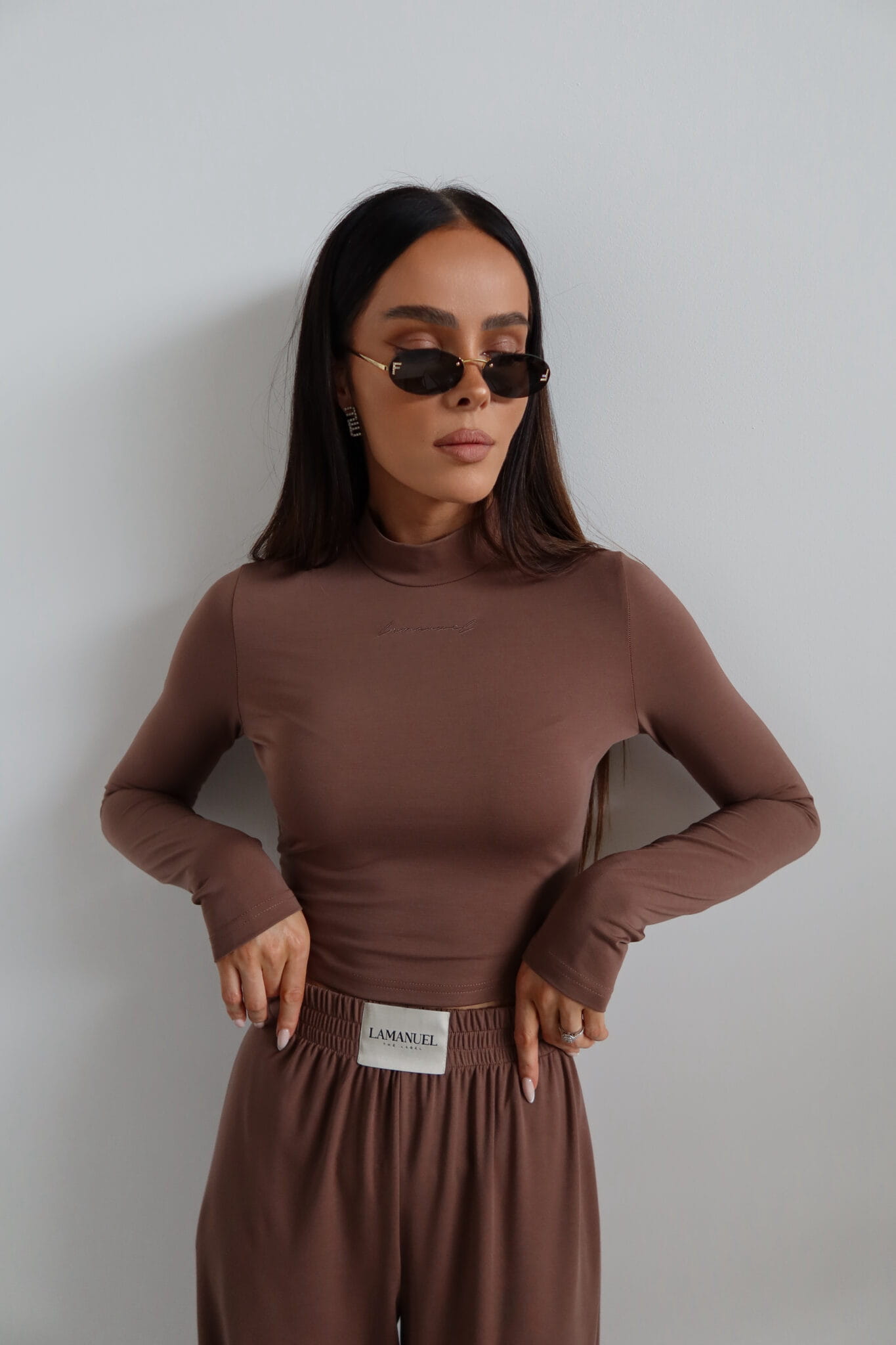 Dopasowany top z długim rękawem wykonany z miękkiej, elastycznej dzianiny modalowej. Posiada zabudowany dekolt i krótszy krój, który idealnie komponuje się ze spodniami z wysokim stanem. Subtelne logo z przodu w kolorze materiału. Komfortowy, oddychający i przyjemny dla skóry.