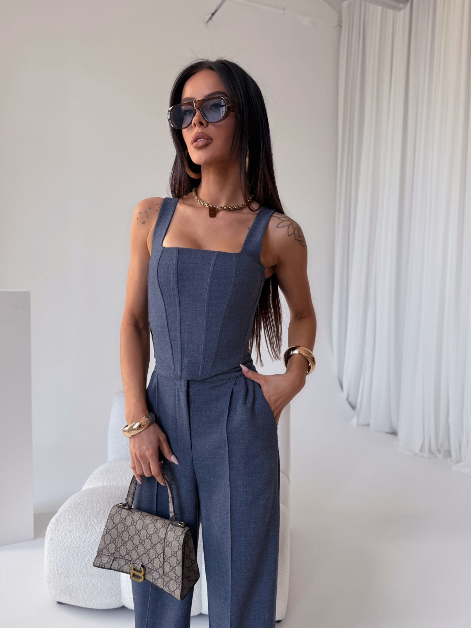 Gorset o dopasowanym kroju, wykonany z eleganckiej tkaniny z subtelną fakturą. Posiada szerokie ramiączka i geometryczny dekolt podkreślający linię ramion. Model usztywniony przeszyciami i fiszbinami, które optycznie wysmuklają sylwetkę. Zapinany na suwak z tyłu, co zapewnia wygodne dopasowanie. Doskonały zarówno do klasycznych, jak i nowoczesnych stylizacji, świetnie komponuje się z szerokimi spodniami i dopasowanymi spódnicami oraz spodenkami.