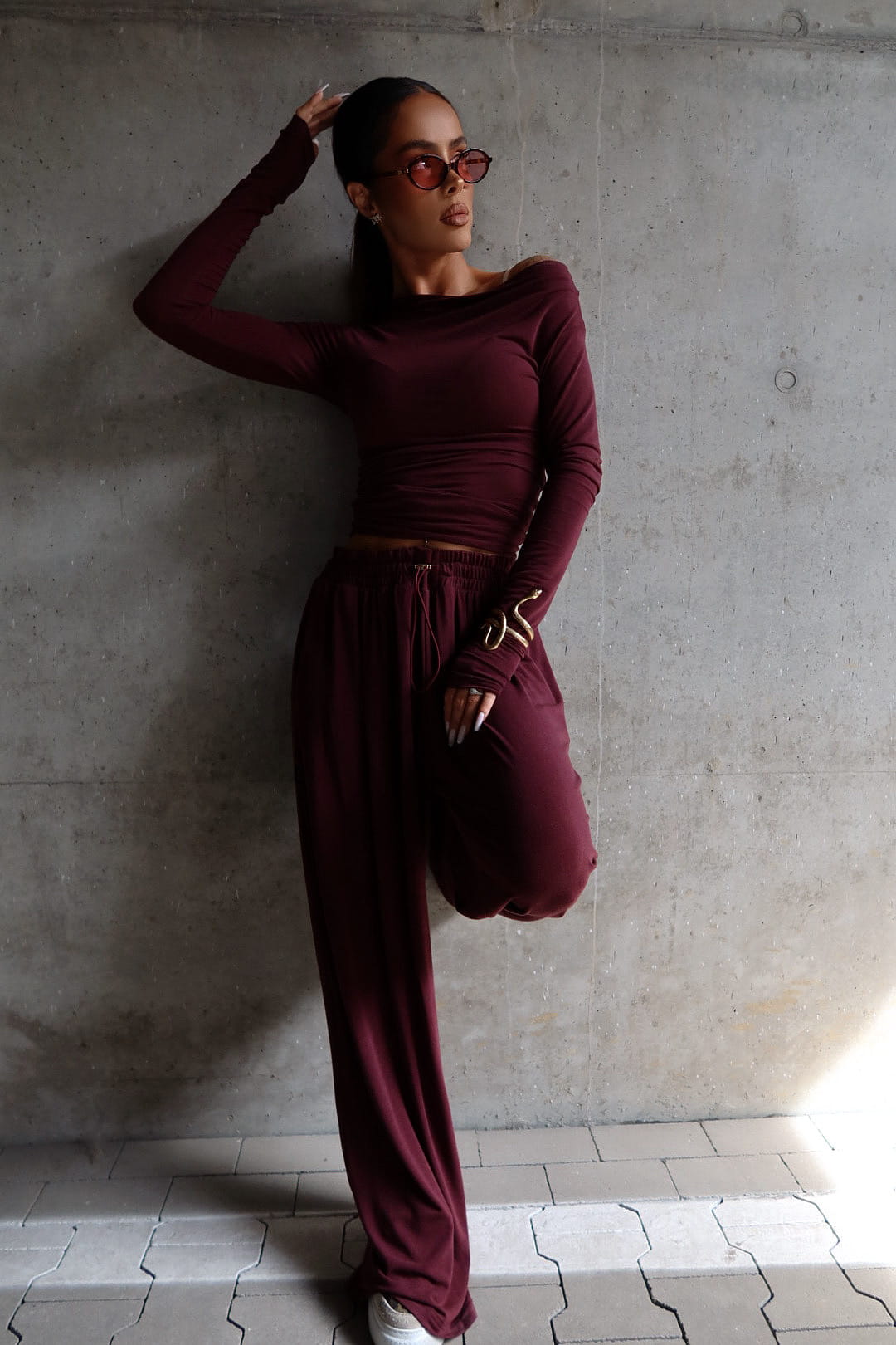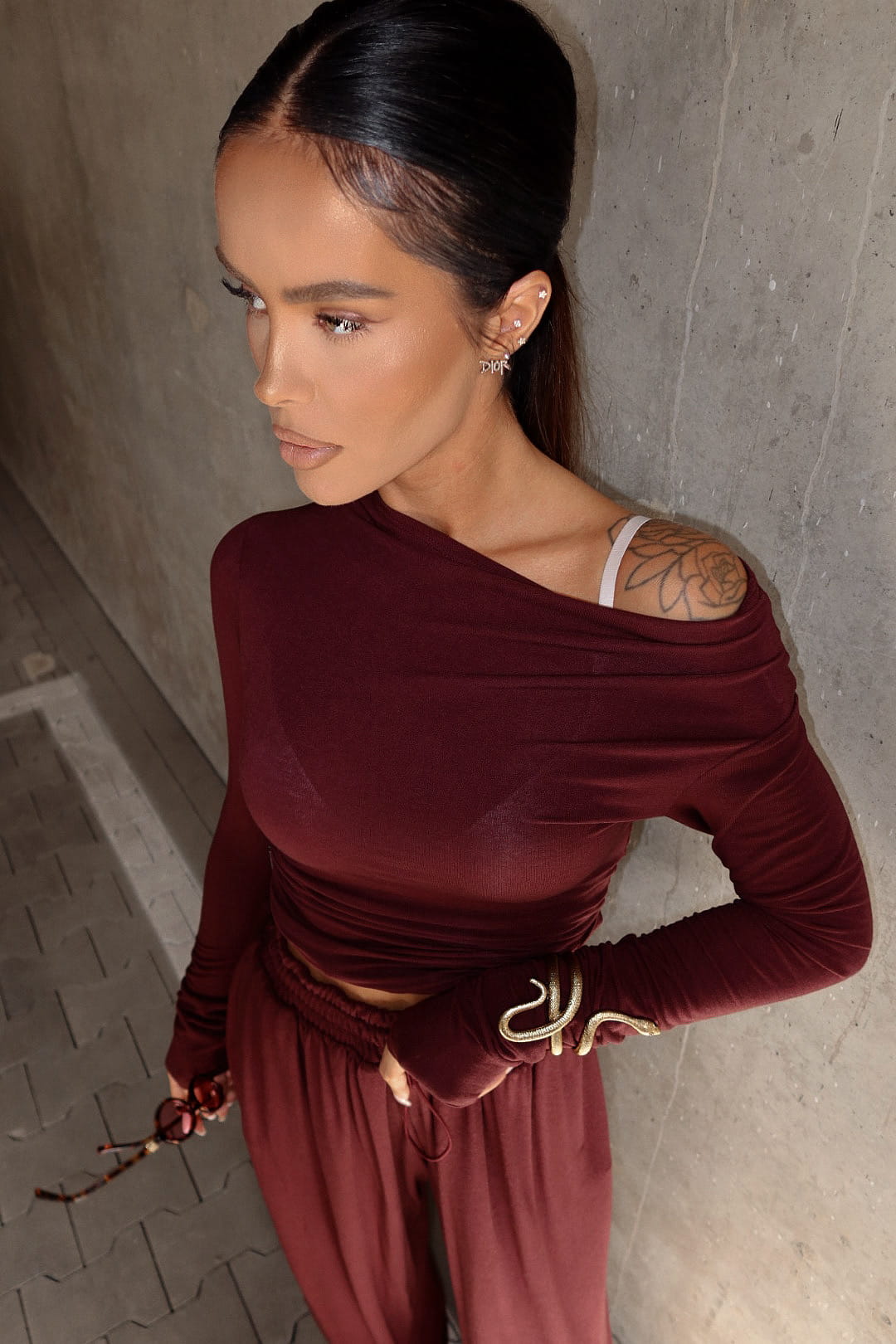 Dopasowany top wykonany z miękkiej, sweterkowej dzianiny o przyjemnej fakturze. Prosty fason z długim rękawem i delikatnie opadającym dekoltem, który pozwala nosić go z odsłoniętym ramieniem. Materiał elastyczny i wygodny, idealnie dopasowuje się do sylwetki. Świetna baza do codziennych, nonszalanckich stylizacji.