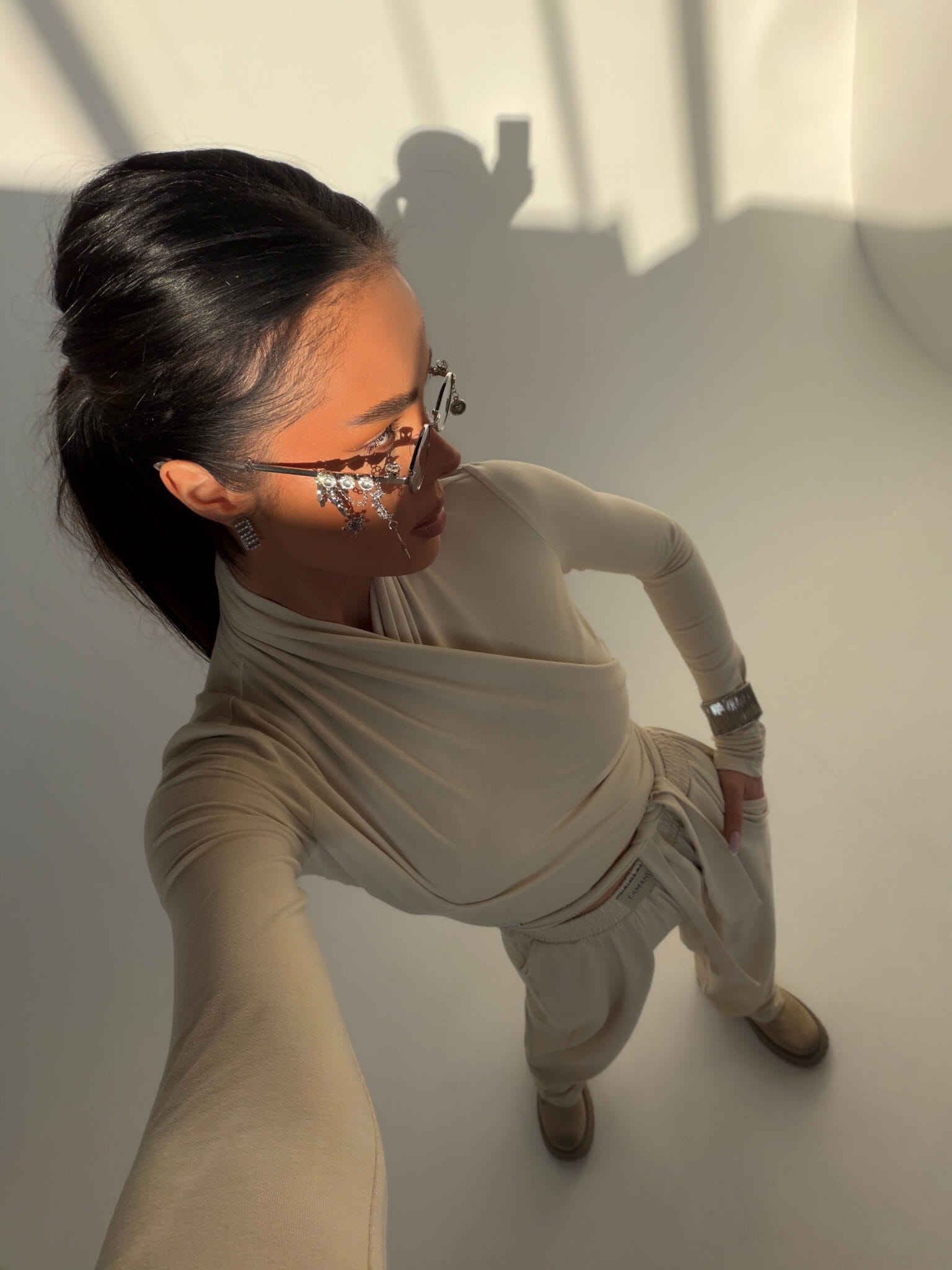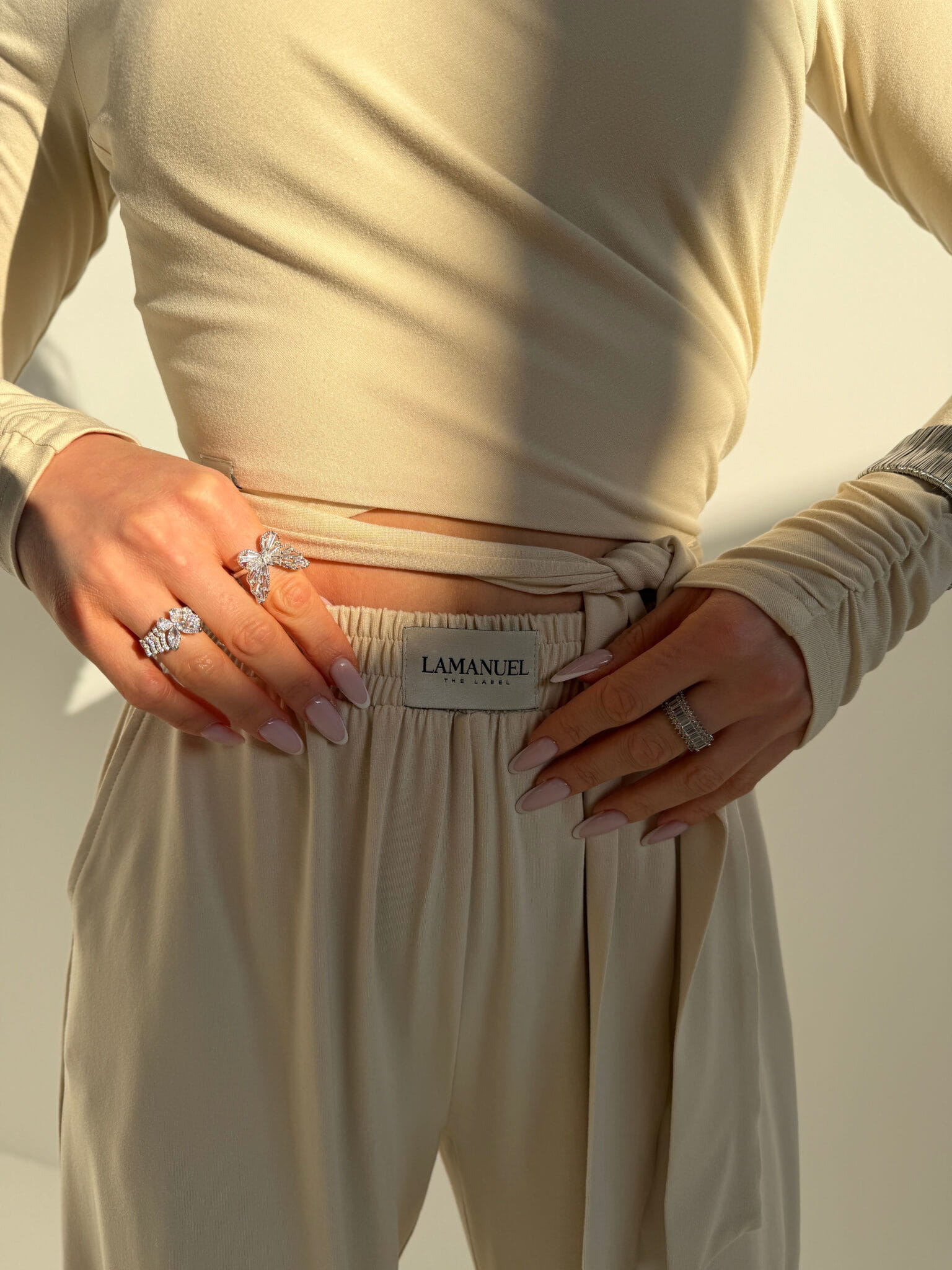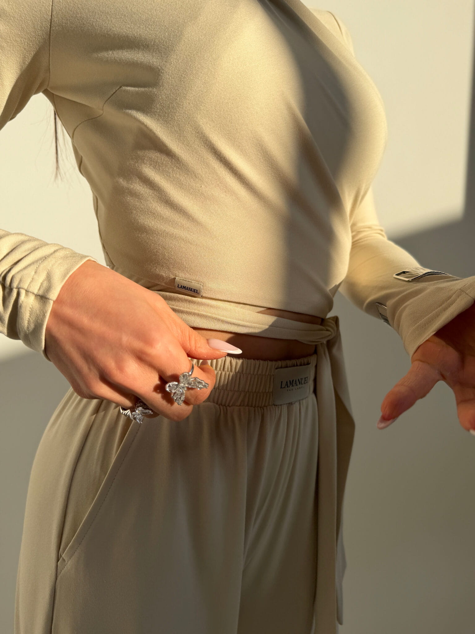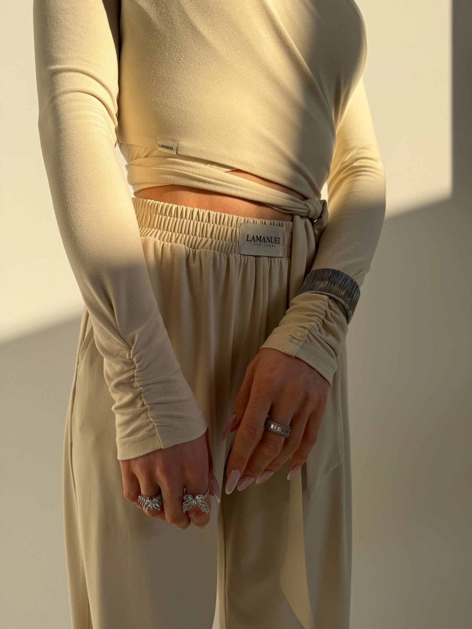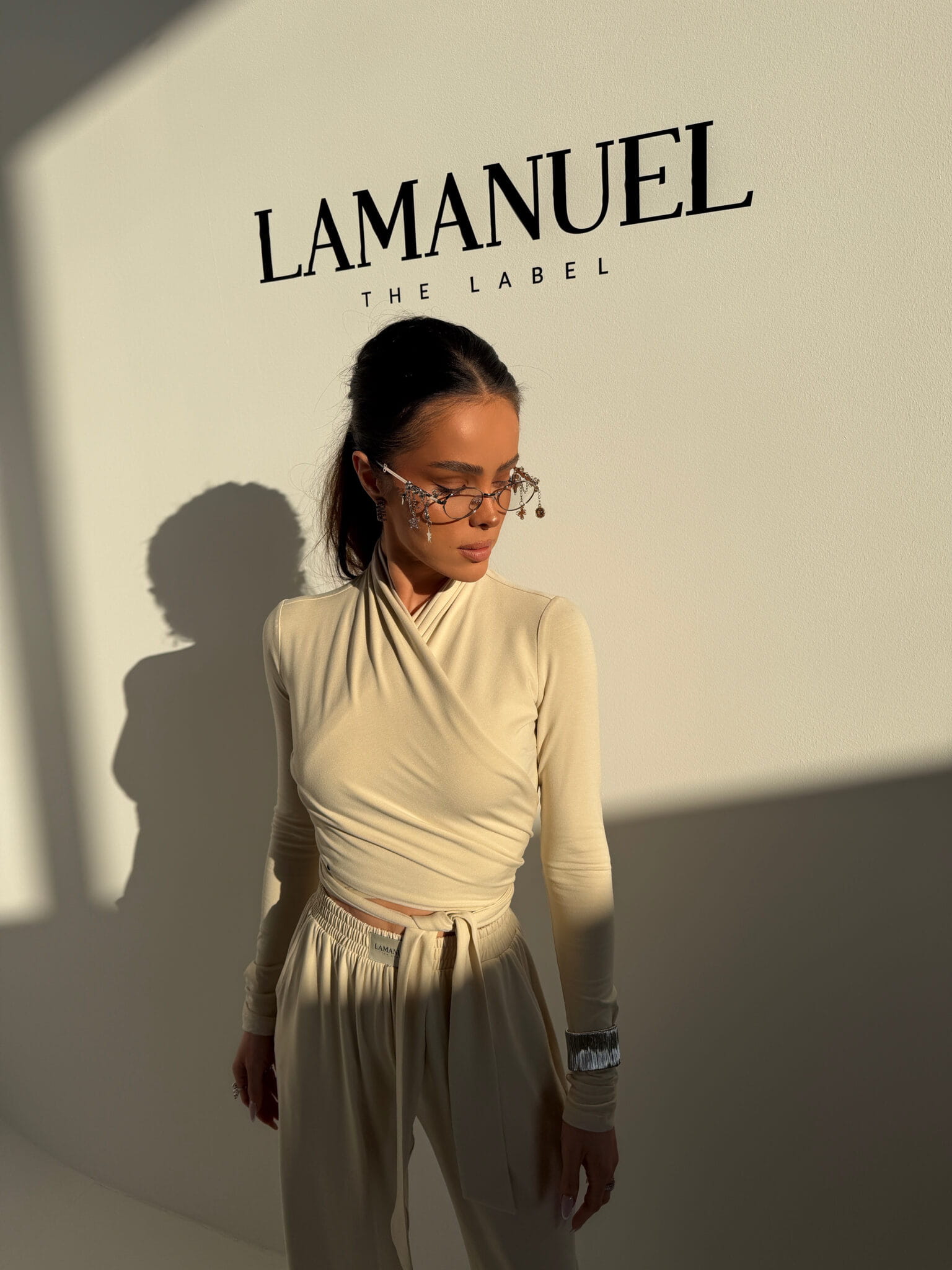 Miękki top z elastycznej wiskozy, który dopasowuje się do sylwetki i podkreśla jej linię. Krzyżowe wiązanie daje możliwość noszenia na dwa sposoby – blisko przy szyi lub z dekoltem w kształcie V. Rękawy z delikatnym marszczeniem dodają lekkości i kobiecego charakteru. Z boku wszyta subtelna metka lamanuel. Model, który łączy wygodę z efektem „wow” – idealny do stylizacji dziennych i wieczornych.