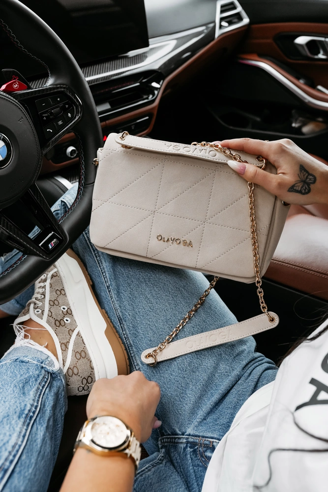 Shoulder bag - pikowana tkanina - usztywniony model z klapą - złoty metalowy łańcuszek - na rączce wytłoczone logo OLAVOGA - detal z metalowym złotym logo na przodzie - magnetyczne zapięcie.